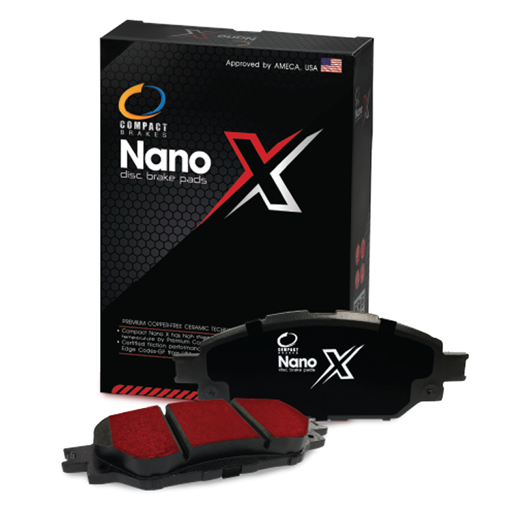 From winding mountain passes to stop-and-go city streets, experience true confidence with Nano X. Independent high-temperature testing confirms that Compact Nano X retains its stopping power over high temperatures, where most standard pads start to fail. Nano X’s proprietary anti-fade surface treatment paired with multi-layer NVH-control shims, and Y-groove slotting to expel heat and debris, guarantees fade-free stops no matter how tough the road gets. Don’t gamble with fade. Choose Compact Nano X and drive with complete confidence.