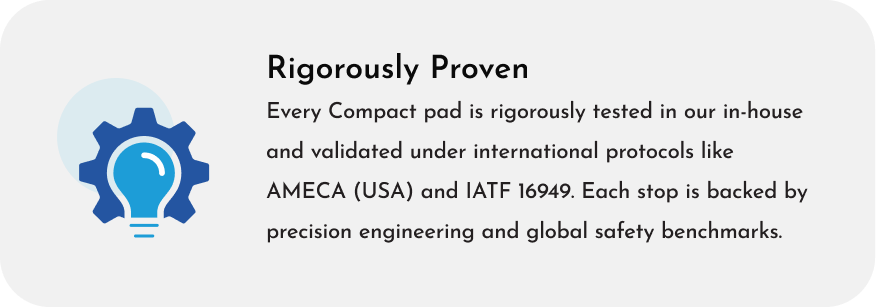 Every Compact pad is rigorously tested in our in-house and validated under international protocols like AMECA (USA) and IATF 16949. Each stop is backed by precision engineering and global safety benchmarks.